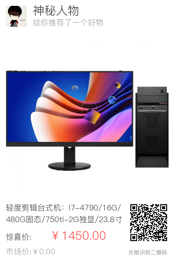 轻度剪辑台式机:I7-4790/16G/480G固态/750ti-2G独显/23.8寸显示屏/飞利浦键鼠套装