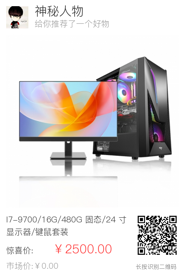 I7-9700/16G/480G 固态/24 寸显示器/键鼠套装