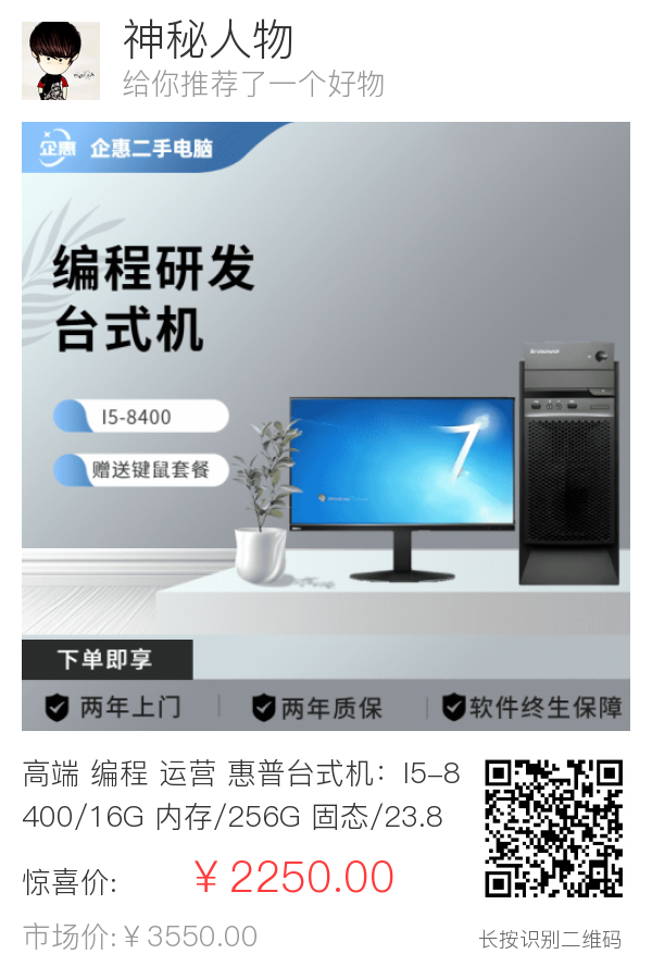 高端 编程 运营 惠普台式机:I5-8400/16G 内存/256G 固态/23.8 寸显示器