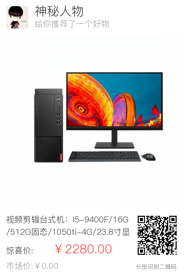 视频剪辑台式机:I5-9400F/16G/512G固态/1050ti-4G/23.8寸显示屏/飞利浦键鼠套装