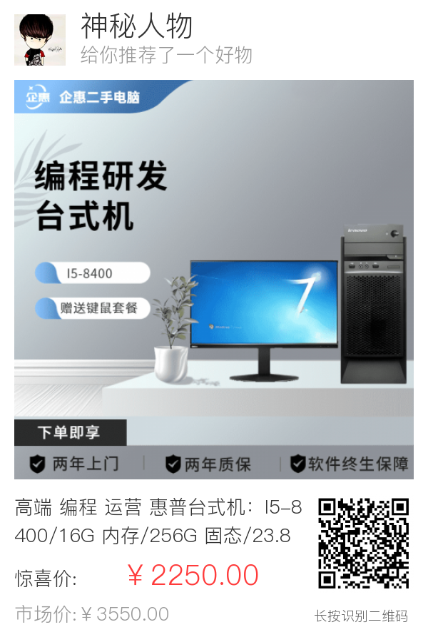高端 编程 运营 惠普台式机:I5-8400/16G 内存/256G 固态/23.8 寸显示器