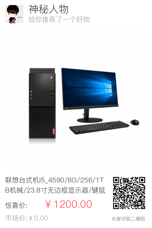 联想台式机I5_4590/8G/256/1TB机械/23.8寸无边框显示器/键鼠套装